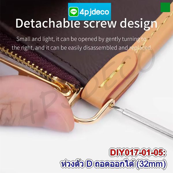 ห่วงตัว D แบบถอดออกได้ เพียงใช้ไขควง สำหรับสายกระเป๋า เป็นอะไหล่สำหรับทำกระเป๋าเดินทาง กระเป๋าเป้สะพาย หรืออื่นๆ ตามต้องการ ความยาว 32mm (เหมาะสำหรับสายกระเป๋าขนาดกว้าง 32mm) รุ่นพิเศษ สามารถถอดแกนสายกระเป๋าออกได้ (แกนบริเวณคอหมา) เพื่อเปลี่ยนสายกระเป๋าเป็นเส้นใหม่ตามความต้องการ